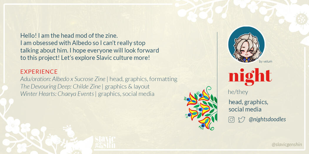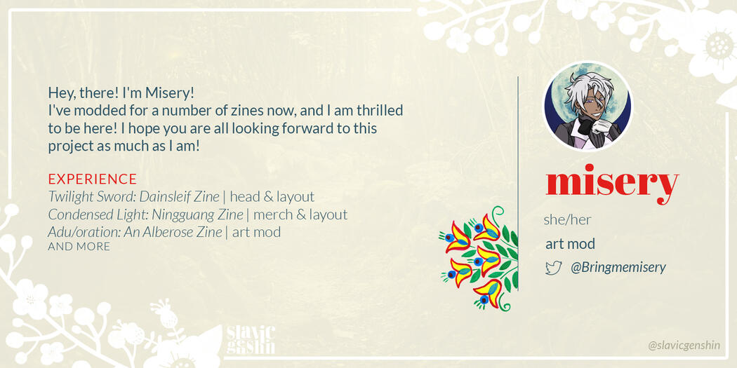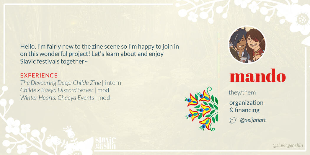 Welcome to Slavic-Themed Genshin Zine, a fanmade, non-official PG-13 SFW zine. This is an Alternative Universe Zine where the Genshin characters meet Slavic folklore - creating space for all the colorful beauty to be seen in art and writing by all talented contributors.